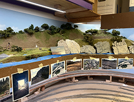 Check out our progress. We are now in the process of adding scenery to the layout, including mountains, rock cliffs, trees and roads.